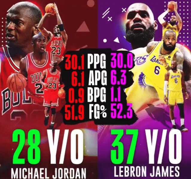 美媒clutchpoints晒出了37岁詹姆斯和28岁乔丹的数据对比,28岁的乔丹场均30.1分6.1助攻0.9盖帽,投篮命中率51.9%,而37岁的詹姆斯场均30分6.3助攻1.1盖帽,投篮命中率52.3%!