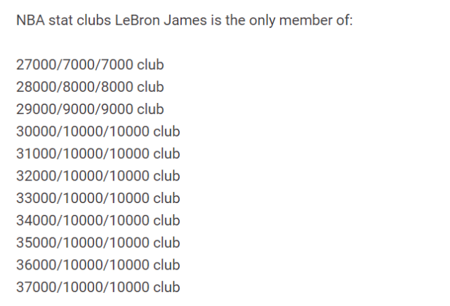 美媒StatMuse曾表示,詹姆斯是27000+7000+7000俱乐部的唯一成员,并一路延续到36000+10000+10000的唯一成员,现在,他又加入了新的俱乐部37000+10000+10000,并仍是唯一成员。11大俱乐部里,都只有詹姆斯一人。前无古人的成就,恐怕也很难后有来者。