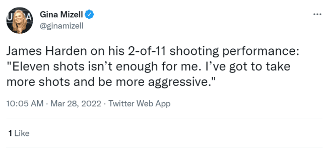 谈到自己11中2的表现时,哈登说:“对我来说,11次出手不够,我要投更多的球,变得更有侵略性。”此前里弗斯曾谈论过哈登进攻的问题,他表示自己更想要一个进攻版的哈登,而不只是控卫版的哈登。哈登为队友创造机会已经够多了,但他个人的进攻威胁还不足。