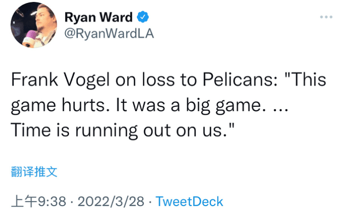 今天不敌鹈鹕之后,沃格尔接受采访,他表示:“这场比赛很痛苦。这是一场重要的比赛。......我们的时间不多了,我们为这场比赛打出适当的紧迫性,但我们无法终结它。”