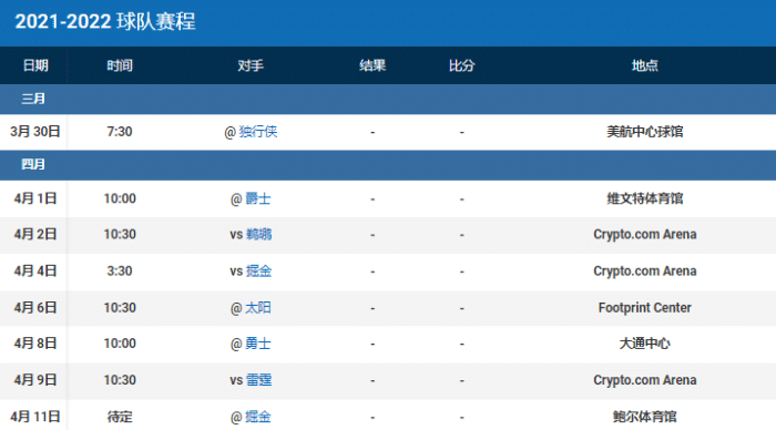湖人目前深陷泥潭当中,当然他们依旧有机会,接下来湖人还有8场比赛,他们的赛程难度高居联盟第三。即便是这样,湖人依旧有杀入附加赛的机会,他将会在5天之后,也就是4月2日,再战鹈鹕,目前湖人落后鹈鹕0.5个胜场,双方本赛季常规赛最后1次交手,湖人不容有失。