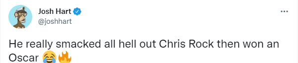在颁奖典礼上,主持人克里斯-洛克在颁发最佳纪录片奖项时,嘲笑威尔-史密斯的老婆,说她现在是光头,可以演《魔鬼女大兵》。随后威尔-史密斯走上舞台,当众掌掴主持人,随后走回观众席,威尔-史密斯怒吼:你那张臭嘴别他TM说我老婆的名字!