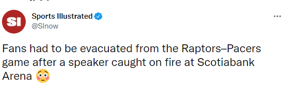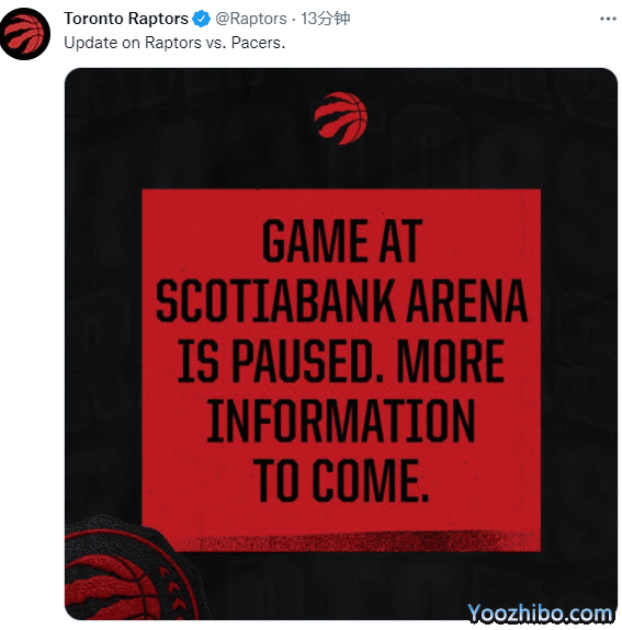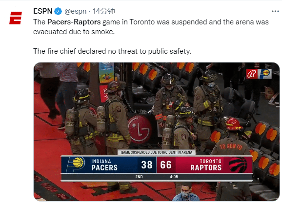 猛龙和步行者比赛打到第二节4分05秒时,猛龙主场球馆出现意外火灾,比赛就此暂停,比赛暂停前猛龙66-38领先步行者28分;两队球员纷纷离场返回更衣室,消防员来到现场,疏散球迷离场,据报道,猛龙主场的一个音箱着火了。