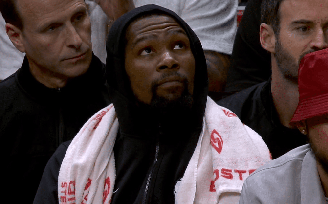NBA常规赛篮网打爆热火,杜兰特出战30分钟14投7中、罚球10中9拿到23分5助攻3篮板2抢断1盖帽,不满判罚吃T,33岁死神冲进观众席,倒地拼抢地板球太拼,险些受伤太惊险;欧文11分6助攻4篮板,也是早早打卡下班。