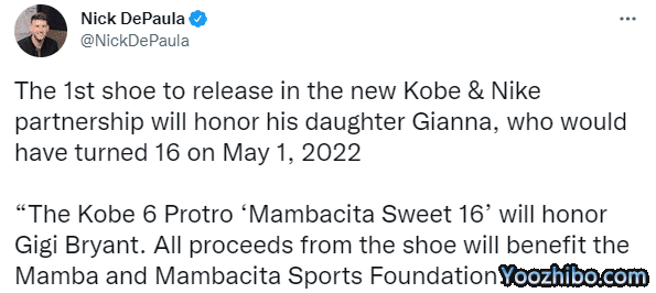 在科比与耐克再次联合的首款球鞋上,脚跟处印有“科比”和GIGI以及曼巴体育基金会logo,还印有Gigi生前所穿的2号。