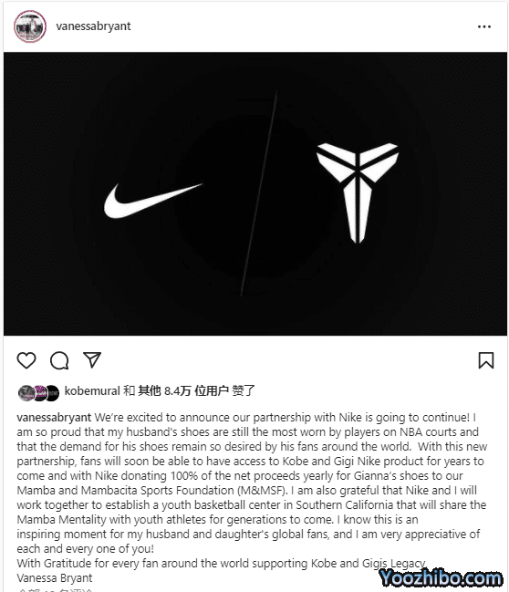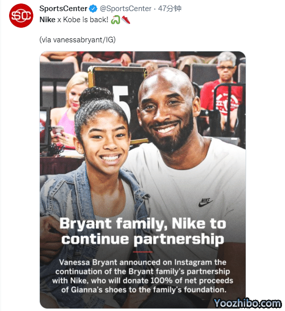 科比遗孀瓦妮莎正式宣布科比品牌重新与耐克合作,科比、Gigi相关产品很快上市,双方将在南加州打造一个青年篮球中心,旨在为下一代年轻运动员分享曼巴精神。