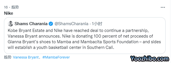 科比品牌重新与耐克联合,这意味着科比球鞋回来了,如此事件冲上热搜引热议,美媒纷纷转发该消息,瓦妮莎-布莱恩特和曼巴永恒两个词也冲上热搜。