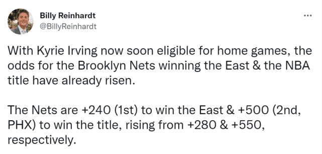 在这一消息出来前,篮网获得东部冠军的赔率是+280,夺得总冠军的赔率是+550,而欧文能打主场的消息出来后,篮网获得东部冠军的赔率是+240(排名第一),获得总冠军的赔率变成+500(排名第二,仅次于太阳)。需要说明一下,数值减少,说明他们被更加看好了。