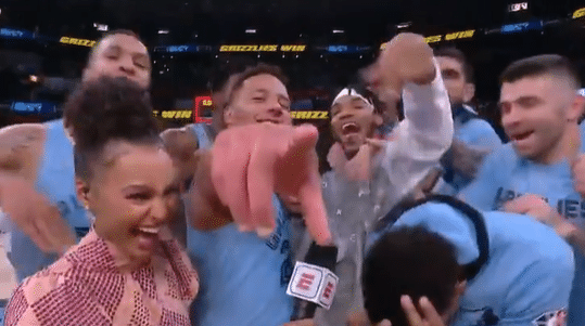第四节打出疯狂的攻击波时,灰熊主场球迷也非常开心,整座球馆陷入沸腾。赛后,灰熊全队都涌向贝恩,围住他疯狂庆祝。因为贝恩在第四节的关键时刻,连续命中3记三分球,彻底击垮了篮网。全场比赛,贝恩拿下23分,而灰熊全队则是7人上双。篮网欧文43分,杜兰特35分,无奈对手彻底暴走。