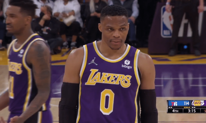 下半场,湖人第三节一直落后10分左右,威少突破哈登并且晃飞恩比德上篮得分,之后因不满判罚而怒吼抱怨吃到技术犯规;威少再次失误,传球直接被哈登抢断,所幸里夫斯成功反抢;随后威少终于命中三分球,第三节最后1分53秒,威少上场再次命中三分。