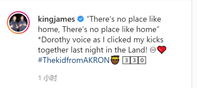 詹姆斯给这组图片配上了文字:“没有一个地方能像家一样,没有一个地方能像家一样。当我昨晚踏上这个地方时,桃乐茜(绿野仙踪中的角色)的这句台词在我的耳边响起!!#来自阿克伦的孩子”。这条社媒发出一小时,点赞量已经突破60万!