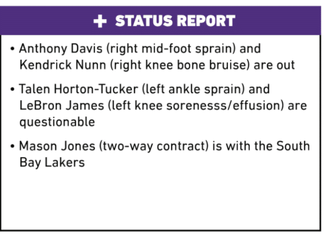 不过,对于老詹来说,眼下的主要目标还是带队保住附加赛的名额,同时争取拿下一座得分王的奖杯,成为NBA史上最老的得分王。湖人明天将在主场迎战76人,根据湖人最新的伤病报告,霍顿-塔克(左脚踝扭伤)和詹姆斯(左膝酸痛/积液)被列为出战成疑。浓眉(右脚扭伤)和纳恩(膝盖伤势)继续因伤缺阵。