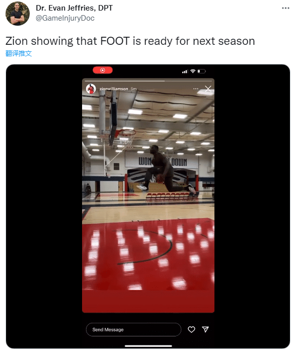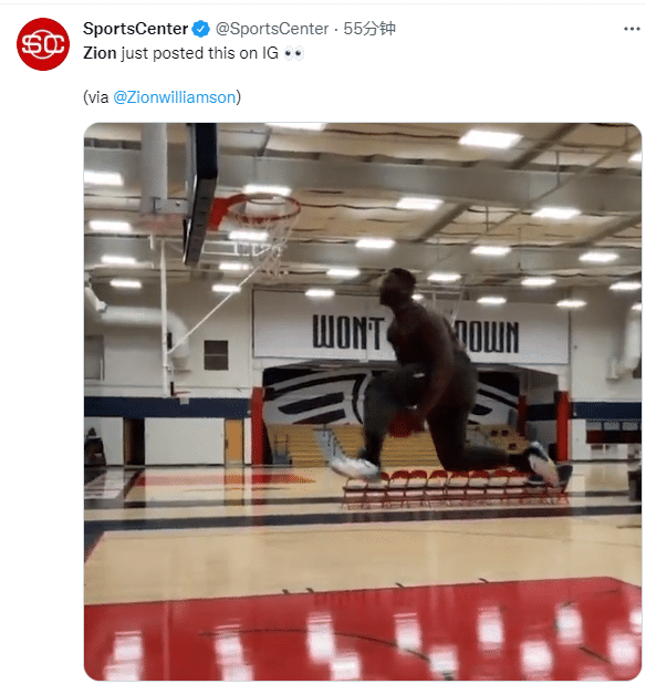 美媒转发锡安扣篮视频,露天看台发推:锡安重返训练馆;Procity Hoops发推:太荒谬了;医学专家Evan Jeffries表示,锡安的脚已经为下赛季准备好了。
