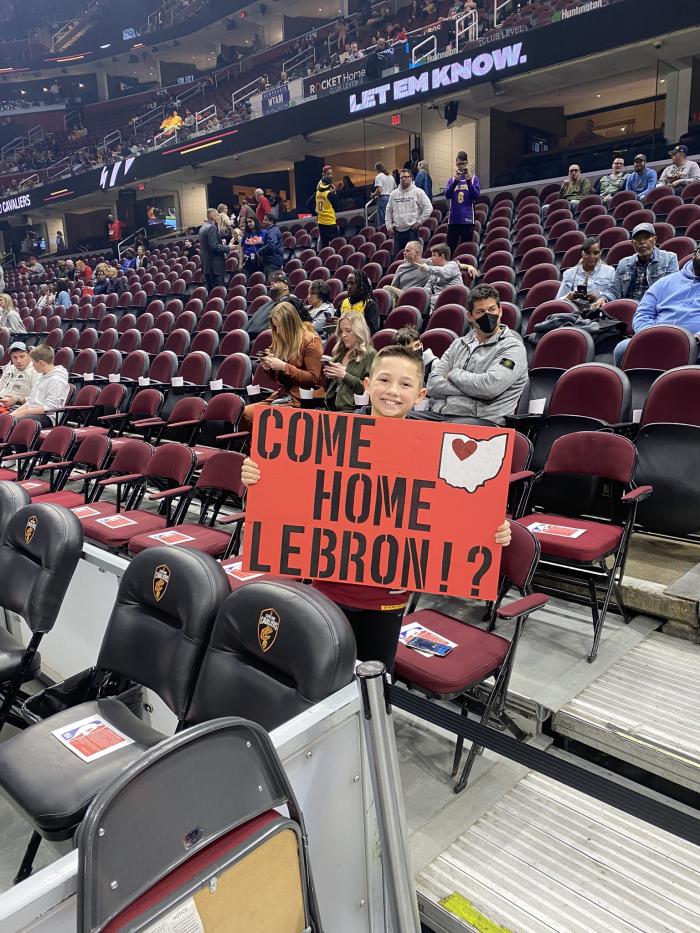 骑士主场小球迷举着标牌,写着“历史得分榜第二,我们心中的第一”和“勒布朗,回家吗?!”一方面恭喜詹姆斯升到历史第二,另一方面希望詹姆斯重返骑士。