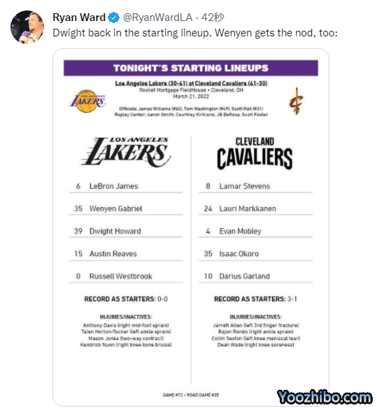 湖人客场对阵骑士,沃格尔再次变阵,安排詹姆斯、霍华德、里夫斯、加布里埃尔和威少首发出战,这是湖人本赛季第一次使用这样的首发,赛季第34套首发,霍华德重返首发;骑士首发阵容是加兰、莫布利、奥科罗、史蒂文斯和马尔卡宁。