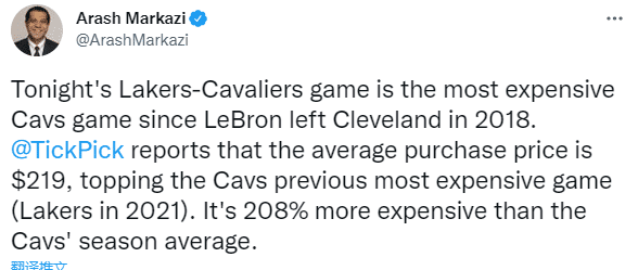 詹姆斯重返骑士的效应很明显,今日比赛创2018年后骑士主场比赛最高平均票价;据湖人记者ArashMarkazi报道,自从勒布朗于2018年离开骑士后,这场湖人vs骑士的比赛是票价最昂贵的一场骑士主场比赛,本场比赛的平均票价为219美元,超过了此前的骑士主场比赛最高票价纪录(2021年对阵湖人)。这比骑士本赛季的主场平均票价高出了208%。