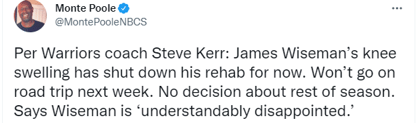 去年4月份,怀斯曼接受了半月板修复手术,期间因膝盖肿胀而再次手术,导致复出推迟了几个月,如今怀斯曼又在接近复出时遭遇膝盖肿胀,复出再次推迟,甚至可能常规赛报销,勇士本赛季常规赛还剩下12场比赛。