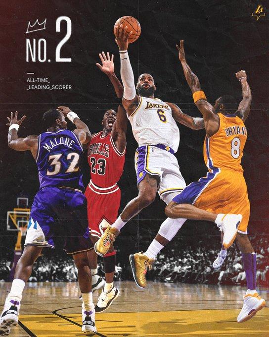 第二节,詹姆斯火力全开,空切暴扣、强硬上篮并且造犯规,随后外线开炮,从第二节8分58秒到7分51秒,短短1分07秒连续命中三记三分,连续砍分助湖人保持两位数的领先,不过湖人突然断电,被奇才打出9-0攻势,随后詹姆斯空切上篮,正式超越马龙破纪录。