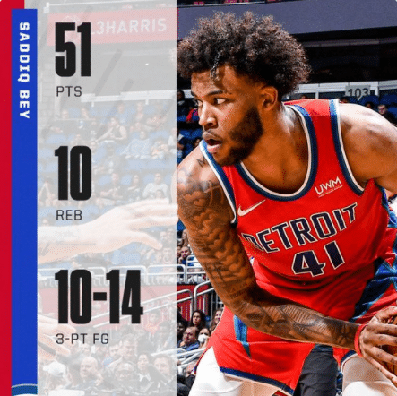 来源:24直播网03-18 11:3224直播网03月18日讯 ,NBA只有一场比赛,但却诞生了赛季的又一场得分50+之战!活塞球员萨迪克·贝全场26中17,其中三分球14中10,轰下了疯狂51分10板!这也是本赛季第17次出现单场50+的得分,而萨迪克贝是其中非常年轻的一位。这场比赛,萨迪克贝也创造了多项个人纪录以及活塞球队的纪录。