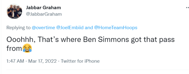 多家美媒也为恩比德送上祝福,最有心的当属OVERTIME了,他们竟然扒出了一段恩比德高中打球的视频,当时的恩比德穿着23号球衣,比现在瘦多了。只见视频中的一个回合,恩比德快攻接到队友的长传,眼看就要轻松篮下得分时,他可能是没调整好脚步,只能把球又给传出去了。球迷们纷纷调侃这一幕神似西蒙斯对老鹰季后赛的那个球。