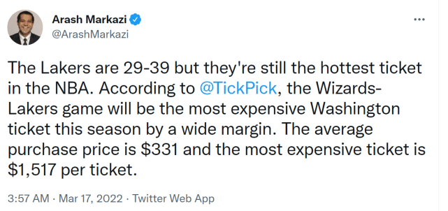 来源:24直播网03-17 16:4724直播网03月17日讯 ,湖人虽然状态低迷,只有29胜39负,但他们依然是NBA最热门的球队之一。据记者Arash Markazi报道,20日湖人造访华盛顿,对阵奇才比赛票价为本赛季奇才主场的最高票价,本场比赛平均票价为331美元,其中最高票价为1517美元。