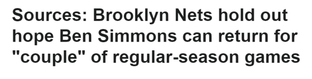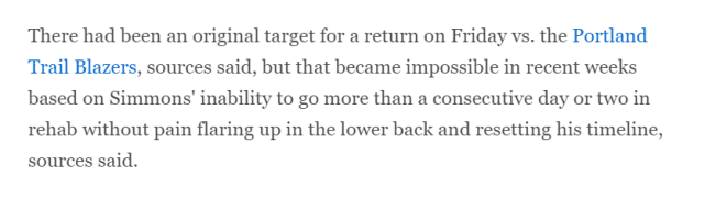 ESPN跟进报道称,本西蒙斯一直因腰椎 L-4 椎间盘的不适而缺阵,但希望他能在东部季后赛前复出参加一些常规赛,可能是4月9月或者11日(北京时间)首秀。消息人士称,篮网最初计划将本周六(北京时间)对阵开拓者队的比赛定为西蒙斯复出的目标日期,但最近几周的伤势发展,让一切变得不可能了,因为西蒙斯无法在连续超过一两天的康复时间中不出现疼痛感。篮网只能重置他的时间表。