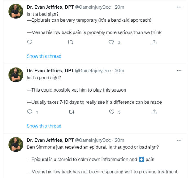 被问及西蒙斯是否需要手术时,纳什表示目前没有人讨论手术的选择,球队依然预计西蒙斯会在本赛季某个时间点复出。专家表示比预期严重,需7-10天才能看到效果,只是暂时疗法。