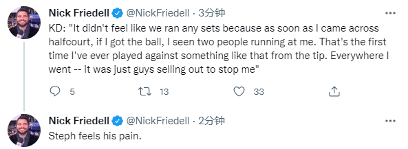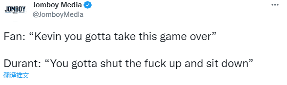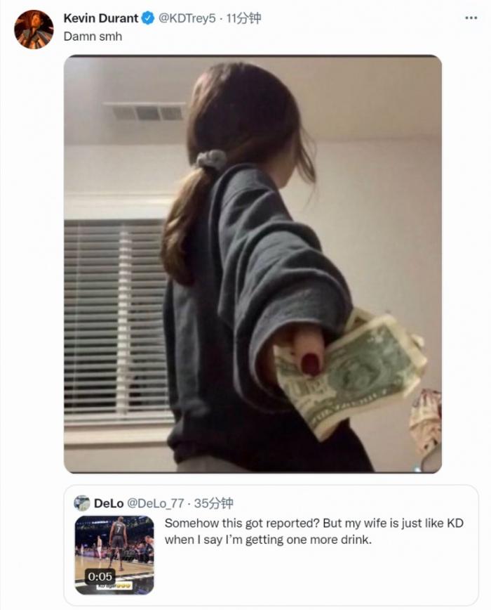 赛后杜兰特又用大号怼球迷,一个球迷转发这段视频并配文:“不知为何这被报道了?我说我想再来一杯的时候,我的老婆说了和KD一样的话。”