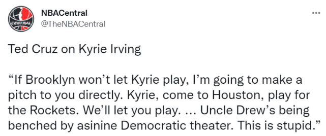 “让凯里-欧文上场打球。如果布鲁克林不让凯里打球,我会直接向你推荐一个地方。凯里,来休斯顿,为火箭打球。我们可以让你上场。他是个很棒的球员,却被摁在板凳上,太愚蠢了。”特德-克鲁兹说道。