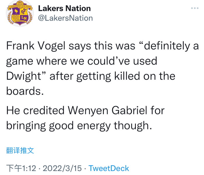 沃格尔还表示绝对是一场可以使用德怀特-霍华德的比赛,加布里埃尔也带来了良好的能量:“尽管他今晚没有投好篮,但他绝对喜欢他的能量。”