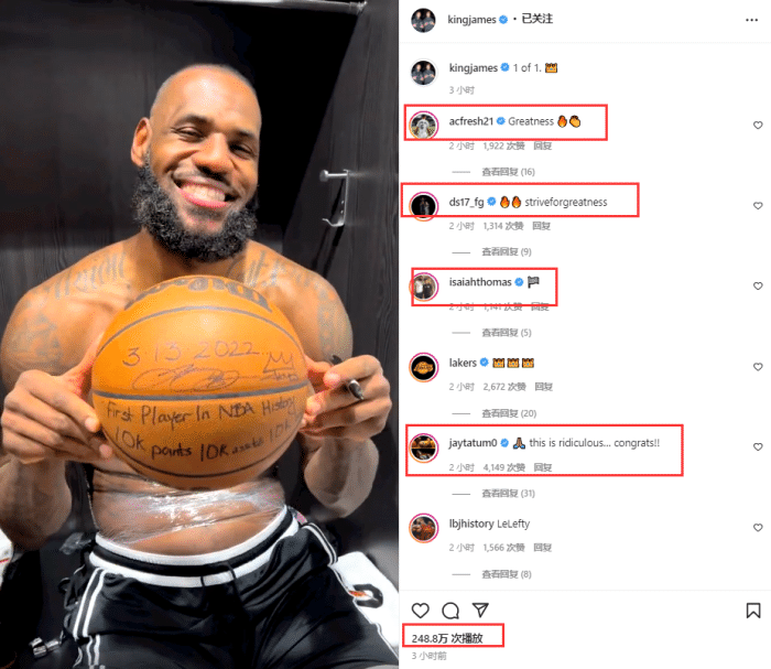 今日赛前,詹姆斯晒出自己打造纪念3万+1万+1万历史第一神迹的签名球视频,配文写道:独一无二——在视频中,詹姆斯坐在更衣室,赤膊出镜并且用左手签名,背部和双膝都包裹冰袋;詹姆斯如此动态引热议,播放次数早已突破240万,塔图姆、施罗德、卡鲁索等球员回帖狂赞老詹。
