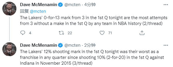 湖人单节12分创赛季单节最低得分,全队第一节25投3中狂打铁,其中三分线外13中0创NBA历史单节最差纪录;上一场湖人惨败太阳,第一节狂输26分;今天对阵猛龙,第一节又挖下21分的大坑。