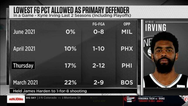 数据显示,2021年3月对凯尔特人一战,他防到对手9中2;2021年4月对太阳一战,他防到对手10中1;2021年6月对雄鹿一战,他防到对手8中0!当然,还有不久前大胜76人一战,他防到对手12中2,其中防到哈登8中1!那场比赛,哈登总计17中3,有欧文的一大部分功劳!