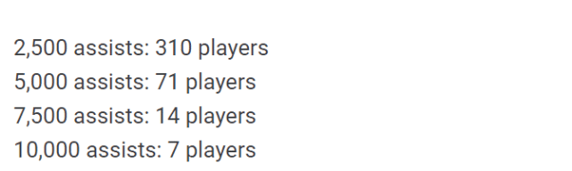 也来看看助攻的金字塔。历史上有310名球员完成至少2500次助攻,71名球员至少5000次助攻,14名球员至少7500次助攻,包括詹姆斯只有7名球员至少10000次助攻。