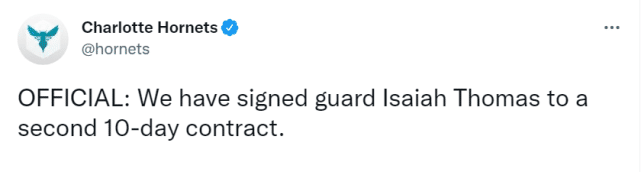 来源:24直播网03-13 16:3824直播网3月13日讯 ,夏洛特黄蜂官方宣布,球队已经和小托马斯签下了第二份10天合同。昔日的“地表最强175”将继续留在NBA赛场打球,如果他表现出色,有望和球队签约至赛季结束。
