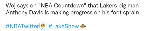“安东尼-戴维斯的中足伤势康复已经取得一些进展,他已经脱掉了保护靴,下一步就是回到场上,进行固定位置的投篮训练,湖人还剩16场比赛,外界对湖人的预期是他们依然能打进附加赛,戴维斯可以在季后赛回归。”