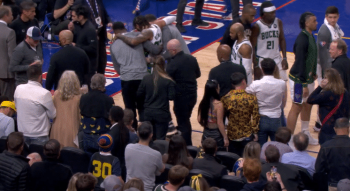 雄鹿和勇士比赛第三节2分31秒,本布里高高跳起补防普尔,落地时踩到普尔的脚,导致身体失去平衡而扭伤膝盖,摔出场外后倒地不起,雄鹿队医赶紧过来,字母哥等球员都围过来,最终本布里被抬走,之后被搀扶着一瘸一拐返回更衣室。
