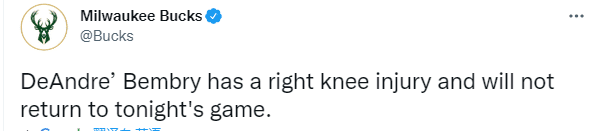 经过初步检查,雄鹿官方宣布本布里右膝受伤,早早退出比赛;本布里仅替补出战3分钟,不幸受伤退赛,但愿他的伤势别太严重。