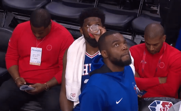 比赛结束后,哈登恩比德第一时间离场,杜兰特疑似看向76人替补席,之后和约翰逊大笑庆祝;杜兰特还和小乔丹有说有笑;赛后杜兰特接受采访,现场篮网球迷集体高呼MVP,表示:现场太安静了,听不见呼喊西蒙斯的声音。