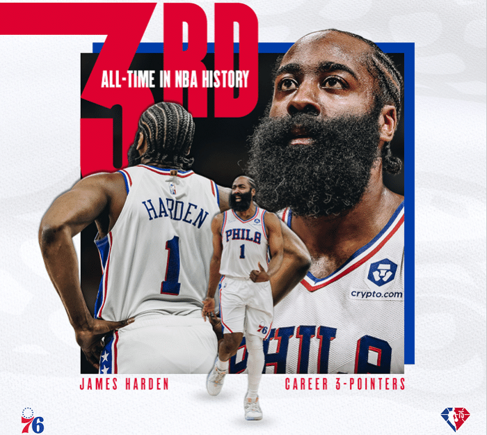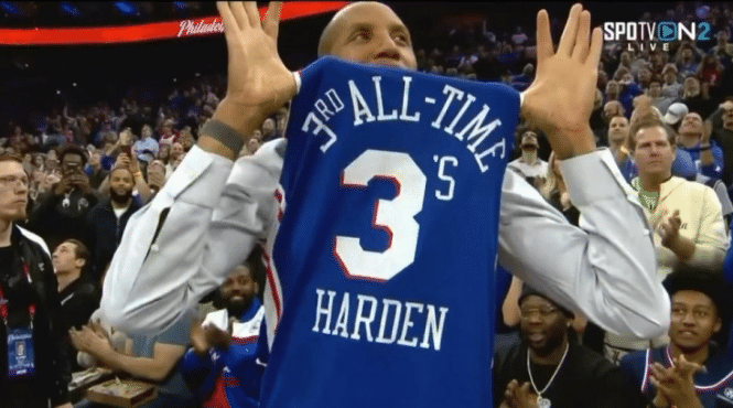 值得一提的是,这场比赛米勒穿着哈登三分纪录的定制球衣也来到了现场,他担任解说员,当哈登命中三分球,超越自己的时候,米勒也展现了自己的定制款球衣,表达了自己尊重,同时也见证了哈登的荣耀时刻。