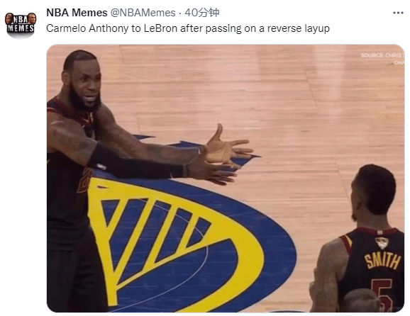 美媒NBA Memes晒出了詹姆斯曾经对JR使用的经典图片调侃:“这就是安东尼接到詹姆斯反篮不上选择传球后的反应;美媒还调侃詹姆斯放弃上篮与去年西蒙斯季后赛放弃上空篮是相同的。