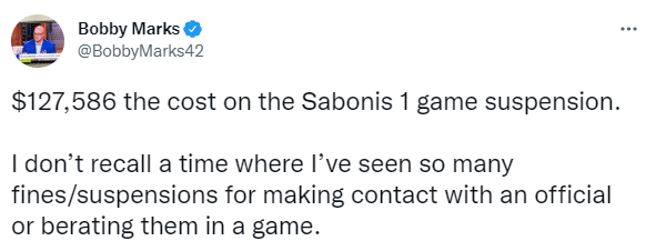 针对此前小萨博尼斯的不理智行为,联盟官方对他追加禁赛一场的处罚,薪资专家Bobby Marks跟进报道,小萨被禁赛一场损失127586美元,还表示联盟已经有太多球员因和裁判发生肢体接触而被罚款或者禁赛。