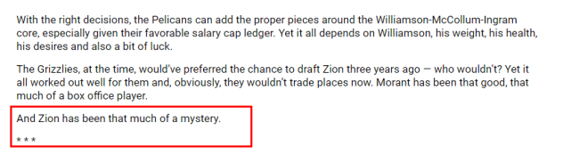 官网还指出,此前没有一个状元秀拒绝过新秀合同后的续约。锡安也不大可能成为第一个,毕竟,这里有太多的钱,他的伤病隐患也需要这份保险。此前有报道称,锡安有资格在今年夏天签下一份5年1.81亿美元的顶薪合同。但官网也表示,灰熊的榜眼莫兰特已经跑在了锡安前面,考虑到锡安身边的种种不确定因素,NBA官网评价锡安时写道:“他一直是个谜。”