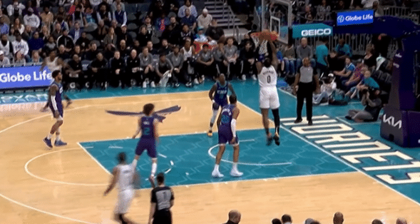 第二节休息之后的德拉蒙德归来,他接到布朗的传球之后暴扣肆虐篮筐。随后当德拉蒙德又一次被普拉姆利封盖之后,转换进攻,德拉蒙德就封盖普拉姆利,进行回一个。德拉蒙德被普拉姆利犯规,他两罚中一。德拉蒙德篮下拔起被犯规,依旧是两罚中一。上半场的德拉蒙德砍下13分6篮板,带队领先黄蜂26分。