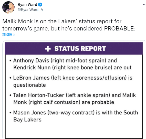 湖人伤病名单上又添一名伤员,蒙克左小腿挫伤,队内还有6名伤员;其中浓眉因中足扭伤已经连续缺席6场比赛,目前没有复出时间表,纳恩至今还没迎来湖人首秀,而詹姆斯膝伤有些加重,上一场湖人不敌马刺,詹姆斯赛前决定因伤休战。