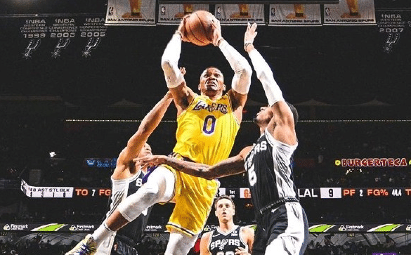 第四节,威少突破进去之后上篮不中,不过他积极补篮得分。当马刺打出一波11-2的阶段,威少抢断约翰逊,随后他还助攻塔克命中三分球。威少摘下前场篮板,他出手被犯规,两罚中一,帮助湖人追分。威少上篮和三分球都没有打进,湖人再度被马刺拉开了比分差距。镜头给到詹姆斯,詹皇脸色铁青,这样湖人遗憾输球,不敌马刺。