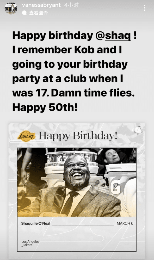 瓦妮莎祝奥胖50岁生快!感慨时光飞逝:17岁时曾和科比去为你庆生