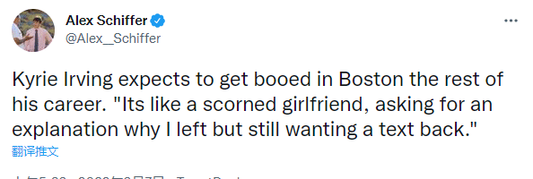 在本场比赛中,欧文遭到了凯尔特人球迷的大量嘘声。对此欧文表示:“预计我在余下的生涯里,回到波士顿都被会被球迷们嘘我。这就像一个被我甩掉的女友一样,她拼命想要得到一个你离开的解释,然后还在等待你给她回短信。