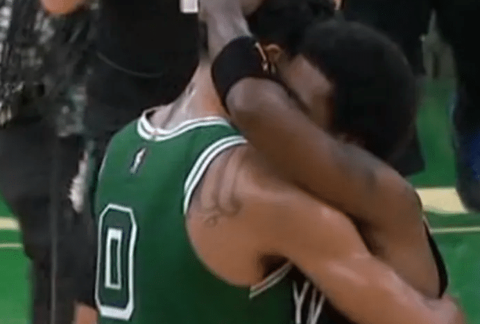 今日一战,24岁塔图姆狂砍54分,下半场34分以及末节18分,带队送篮网4连败,赛后塔图姆和欧文拥抱,他们曾并肩作战,如今欧文早已改穿篮网战袍。