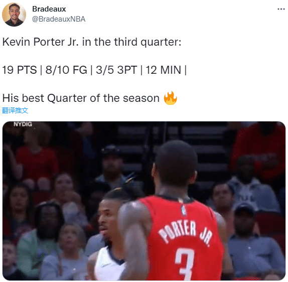 前三节,杰伦-格林贡献19分7篮板4助攻,伍德则拿到25分9篮板;末节火箭11-4领先到7分,关键时刻,杰伦-格林不讲理压哨得分,小波特持球杀到禁区上篮得分,此时小波特开心跳舞庆祝,比赛还剩2分42秒,火箭领先灰熊10分。
